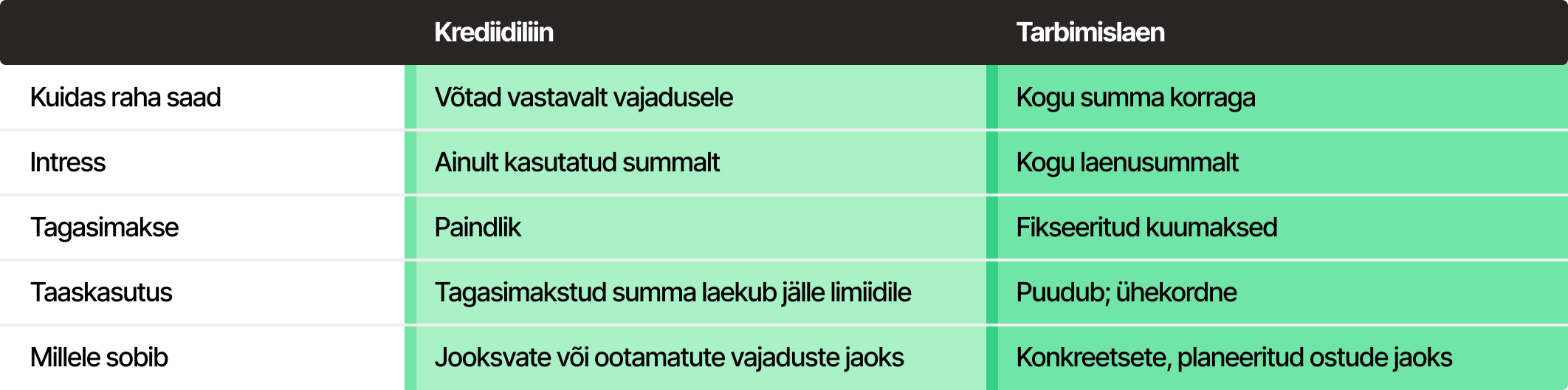 Krediidiliin on paindlik ja taaskasutatav. Tarbimislaen on struktureeritud ja fikseeritud. Kumb sobib sõltub sellest, milleks sul raha tegelikult vaja on.