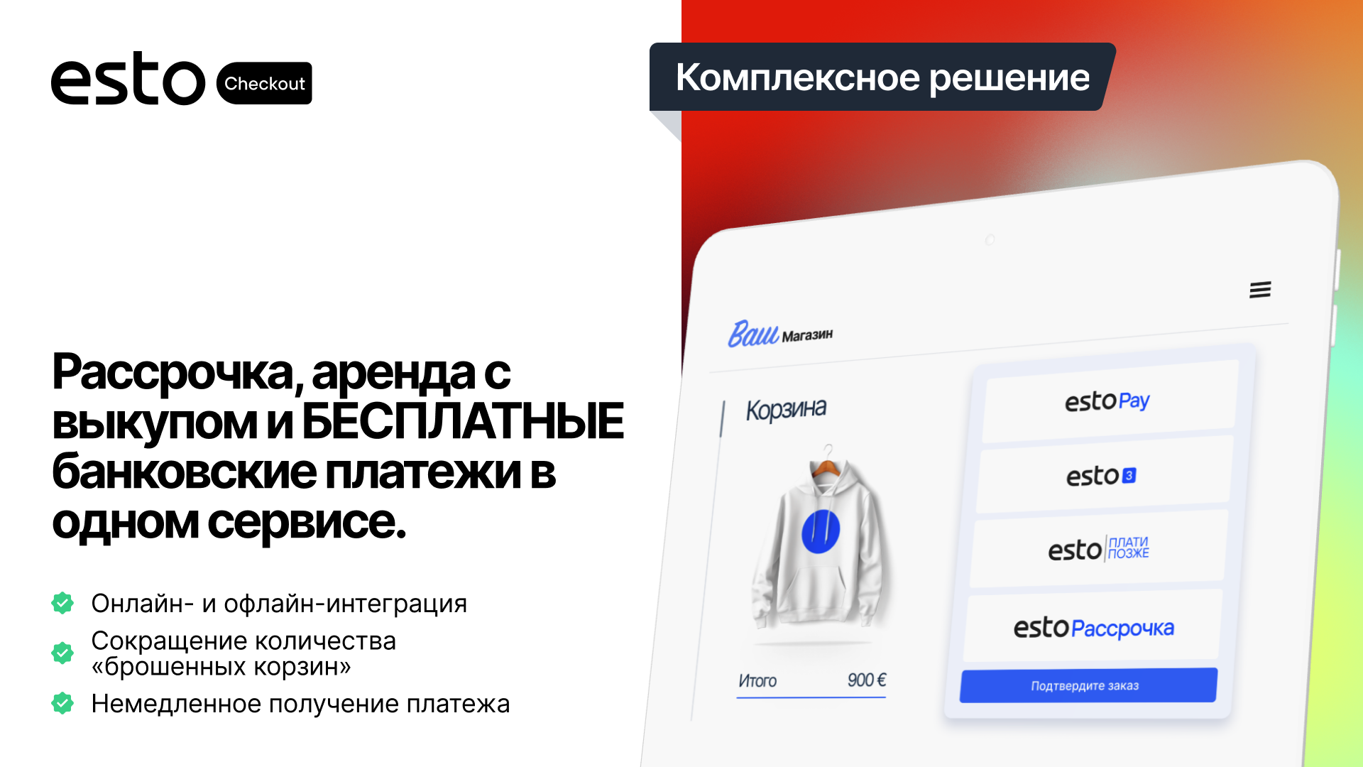 - ESTO Оплата в рассрочку: это решение позволяет приобрети дорогостоящие товары, совершив до 60 частичных платежей с нулевым депозитом. Клиенты могут совершать крупные покупки, не испытывая при этом финансовых затруднений, а потому с большей вероятностью согласятся приобрести дополнительный товар.
