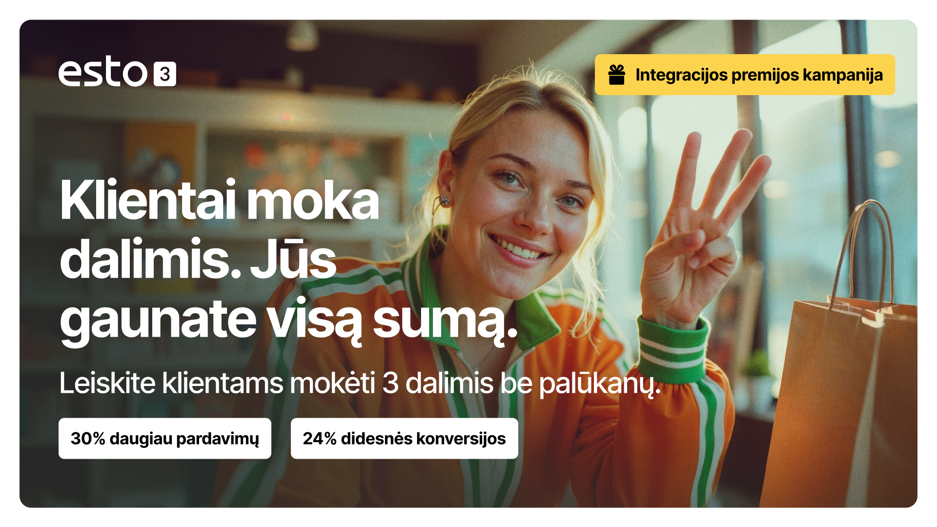- Išskirtinė nauda: Sukurkite akciją, skirtą tik ESTO naudotojams (pvz., „Papildomai 10 % nuolaida, atsiskaitant per ESTO 3“). Taip klientai turės aiškią priežastį rinktis būtent jūsų, o ne konkurento parduotuvę.